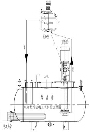 正常生產中,熔鹽介質經熔鹽槽內的電加熱器,加熱到一定的溫度后由熔鹽泵輸送給熔鹽換熱器,將熱量傳給熔鹽換熱器內的物料,放熱降溫后自流回熔鹽槽,熔鹽槽內的電加熱器不斷的對熔鹽介質加熱,再經過熔鹽循環泵強制液相循環將熔鹽介質的溫度傳送給熔鹽換熱器內的物料,周而復始循環,熔鹽槽內的電加熱器不斷的在加熱,熔鹽泵不停的工作,被加熱的熔鹽介質不斷的循環流動,熔鹽換熱器內的物料不停的吸收熱量,直到熔鹽換熱器內的物料達到工藝溫度后,再停熔鹽泵,熔鹽介質通過熔鹽的自重回到熔鹽槽中。