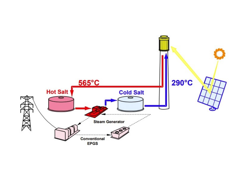熔鹽塔式光熱發(fā)電,雙罐熔鹽儲(chǔ)熱系統(tǒng)是光熱發(fā)電系統(tǒng)圖