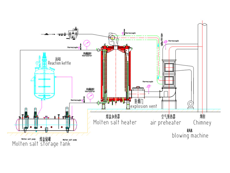燃燒系統:主要由燃氣供給系統、燃燒器、熔鹽爐、煙道防爆門、空氣預熱器、煙氣余熱換熱器、煙囪及有關閥門管線組成。